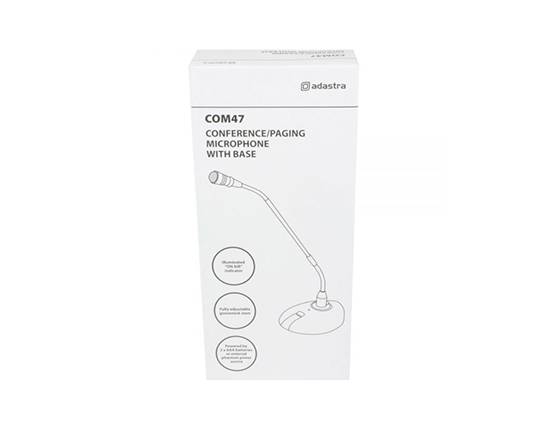 A gooseneck microphone with base for conference or paging applications. Connection to the base is via XLR and provides power to the condenser microphone capsule either from 2 x AAA batteries in the base or from external phantom power.