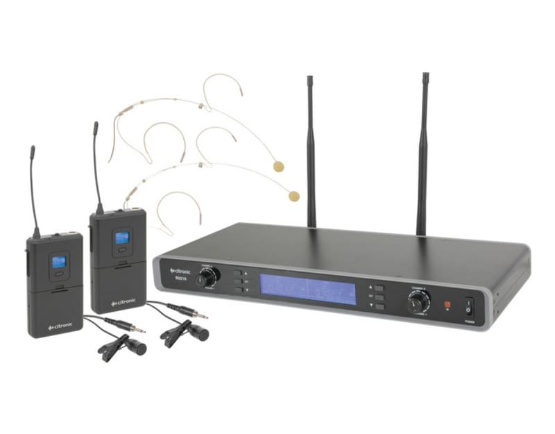 Dual channel PLL tuneable UHF wireless system with 2 beltpack transmitters and a choice of neckband microphones or lavalier microphones. The receiver unit is compatible with standard 19" racks using the included rack ears and front mounting antenna accessories. The RF carrier frequency is selected on the receiver and synchronized to the transmitter via infra-red at the touch of a button. Up to 2 RU210 systems can be operated together on the EU licence-free band.
